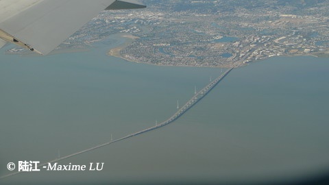 机翼下的旧金山湾和大桥