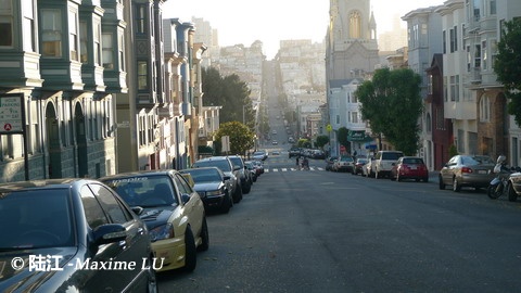 旧金山的旁晚雾霭和起伏道路