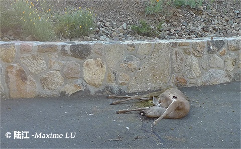 加州纳帕有鹿跃酒庄,顾名思义,必有鹿出没,我也一直期待能碰到如此神鹿。 前两天从纳帕谷底穿越山区途中,我终于遇到鹿一头,可惜是没有跃过去的鹿,已坠地而亡,被一群加州山鹰(Condor)啄食,我也是头回见着如此真切残酷的自然界进餐场景,印象颇深。不过对鹿跃酒庄的期待倒是有所增加。
