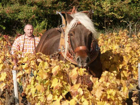庄主Olivier Guyot是个精壮的汉子,母亲在1963年采收季结束的第一天生下了他。Olivier的父亲在葡萄藤育苗中心工作,也是他教会了Oliver如何嫁接,如何剪纸,如何翻土,永远保持对大自然的崇敬。Olivier Guyot从1990年开始接手酒庄,从1998年开始使用有机以及生物动力法耕作。在一次外出度假之后,他家添置了新的成员,马儿Indigo。如今Indigo已经在酒庄工作了快10年。生物动力耕作法并不是一件省时省力的事情,在霉菌肆虐和勃艮第不稳定的天气状况下,任由葡萄自己发展,酒农不做干预,这也是需要多年的精心耕作,才能让葡萄自己有足够的抵抗力。10年对葡萄田的精心耕作已经让他无需再使用化学除草剂,而2003年,当勃艮第受热浪侵袭,葡萄受干旱困扰的时候, 他的葡萄藤已经有10-15米的根系,得以找到足够他们存活的水源,这给了他继续下去足够的动力。