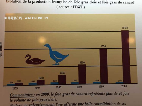 好,现在来重新明确一个概念,由于鹅肝成熟速度慢,繁殖率低,我们常吃的鹅肝其实是以鸭肝为主。以下这张图是自1975年起鹅肝工业中使用鸭和鹅的比例: