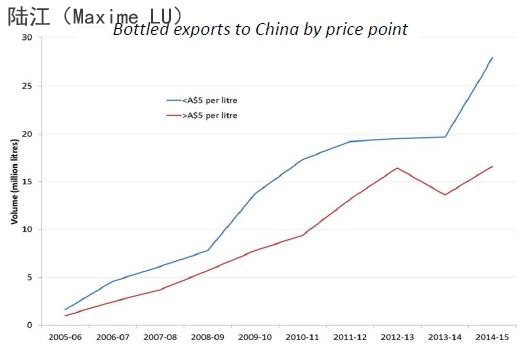 从这数据分析就可以看出,对于澳大利亚葡萄酒来说,中国市场的潜力和重要性都是不容忽视的。为了更好了解澳洲葡萄酒在中国市场的发展情况,接下来我们再来看一张图表,这是出口到中国大陆的瓶装澳洲酒,分两个价格区间的出口量走势图。