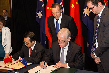 Image: Australian Trade and Investment Minister Andrew Robb and Chinese Commerce Minister Gao Hucheng signing the China-Australia Free Trade Agreement in Canberra on 17 June 2015, witnessed by Prime Minister Tony Abbott. Photo: DFAT/Andrew Taylor