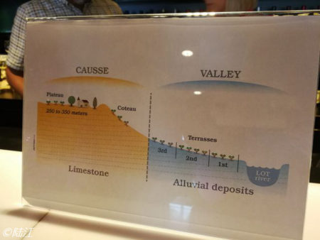卡奥产区葡萄园的范围从洛特河岸低海拔区域到中央高地(Massif Central)区域。产区主要被分为两大类,高地(Causse)和河谷(Valley,Terrasses)。为了让我们能直观了解到卡奥产区不同区块的风土的差异,卡奥葡萄酒行业协会还带我们参观了一处典型区块,在那里能清晰看到河谷区域主要被分为三部分:最靠河边的区域为T1(Terrasses 1),土壤以肥沃的冲击土粘土为主,产量大,出产的酒简单柔和易饮;T2(Terrasses 2)是河谷稍微远离河岸的区域,与T1有路为界,明显以粘土为主,出产的酒饱满;T3(Terrasses 3)是海拔相对较高的河谷区域,T3在参观的区域能明显看到被马路分为上下两部分,上方以石灰石为主,还有少量粘土,而下方区域以鹅卵石和粘土为主。T3和T2也是以路为界。