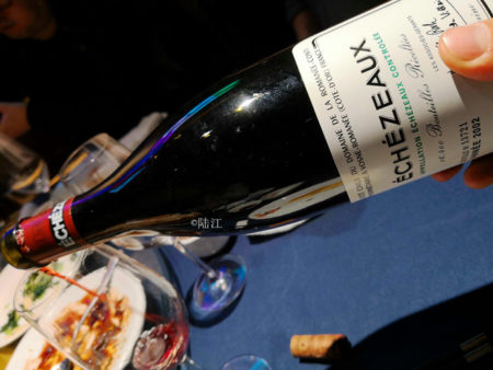 压轴的DRC- Domaine de la Romanee conti Echezeaux 2002,一直杯醒,随着时间推移,黑樱桃,西方香料,果味为主,逐渐透出一丝肉汁,皮革,烟叶气息,中重酒体,集中度很好,单宁中偏强,粉状细致单宁,收敛成一个个迷你天鹅绒球,完整结构,酸度中等略强,干净活跃,有层次,回味长,有深度有很好的陈年潜力。前一款pommard其实水准不错,可就怕有比较,明显这款会更复杂深邃。