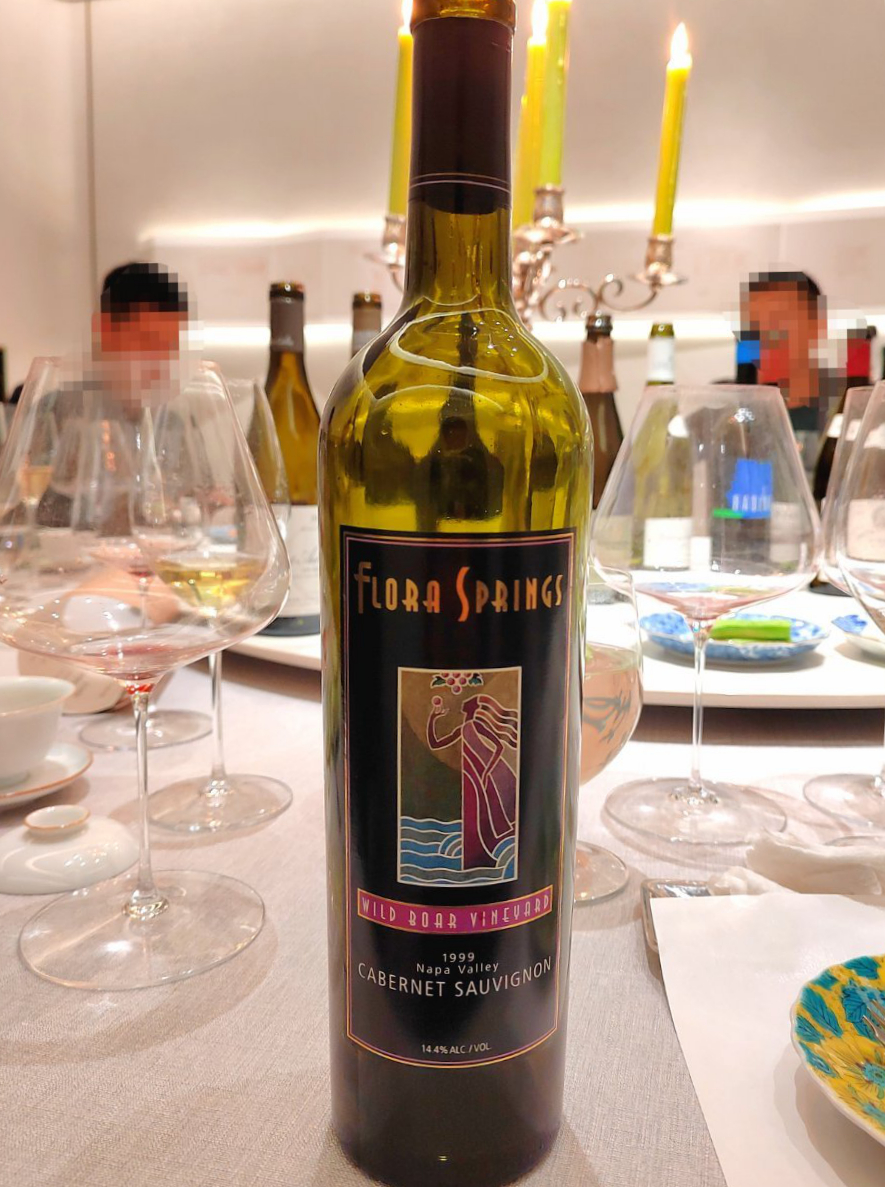 聚餐时喝了这款,已有26年陈年的加州纳帕的Flora Springs Wild Boar Cabernet Sauvignon 1999 。席间HS说,现在大背景下,中老年美国葡萄酒,且喝且珍惜。哈哈,还真是。