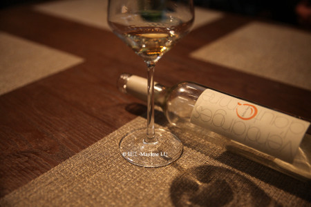 “它的甜酒是以白歌海娜(Grenache Blanc)为基酒,然后浸泡麝香(Muscat)品种的贵腐葡萄(水分散失较多,接近葡萄干)而得。第一次发酵完成,有偏高酒精度,然后加入Essencia(有高残糖量)降低酒精度,同时提高含糖量,大致到110g/l左右。虽然是酸度偏低的Muscat,酒里酸也能到4.8克/l(以酒石酸计,风干导致酸度也集中)。品鉴时能感受到充沛的热带水果和麝香气息,还有一丝金银花香气,清新,中等酸度,蛮细致。年产仅1800多瓶,大部分自留待客之用。它也是法国南部唯一一个用托卡伊的非典型方式酿造甜酒的。”