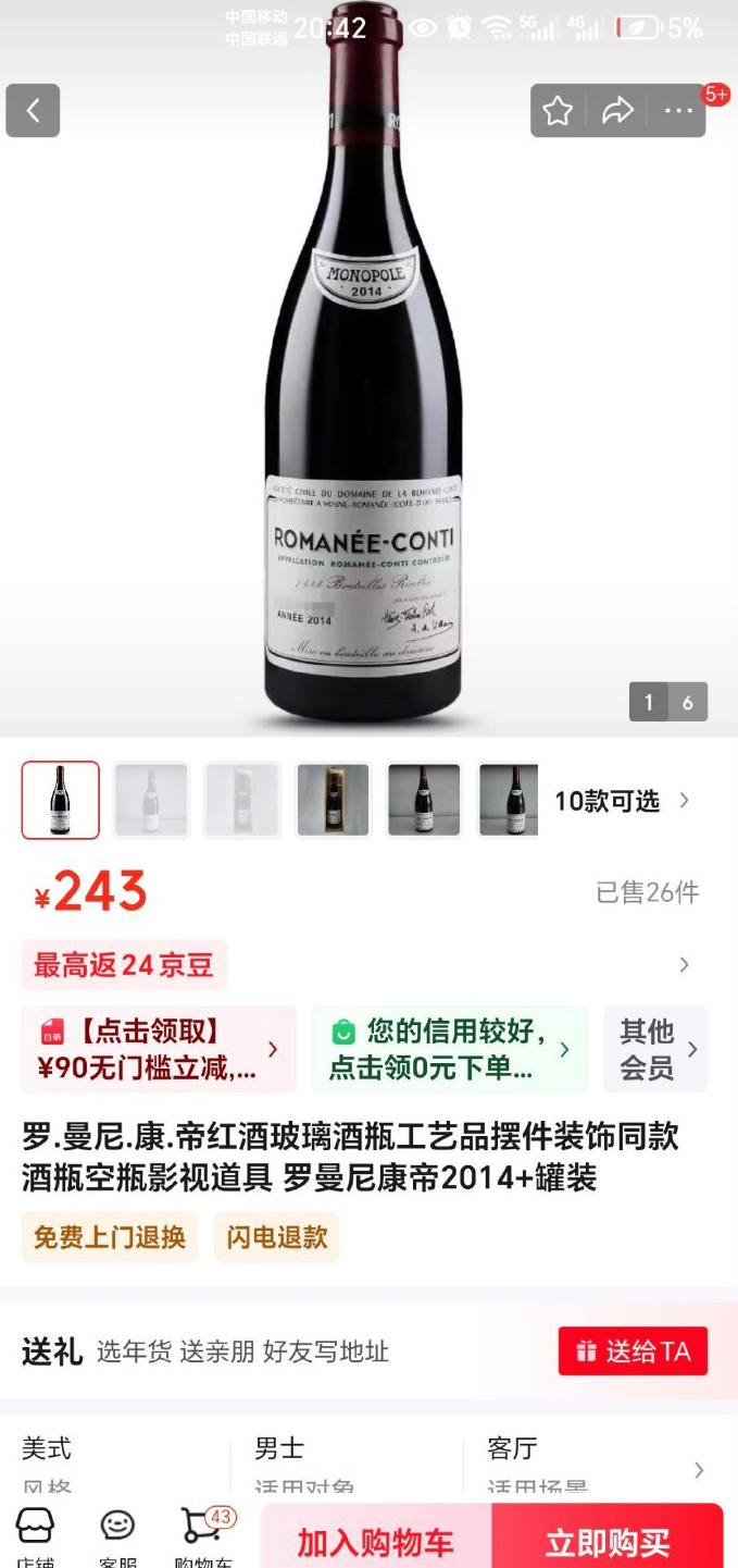 对了,京东平台还有卖罗曼尼康帝空瓶工艺品,不知道做工如何,挺适合自媒体拍视频装大个的。
