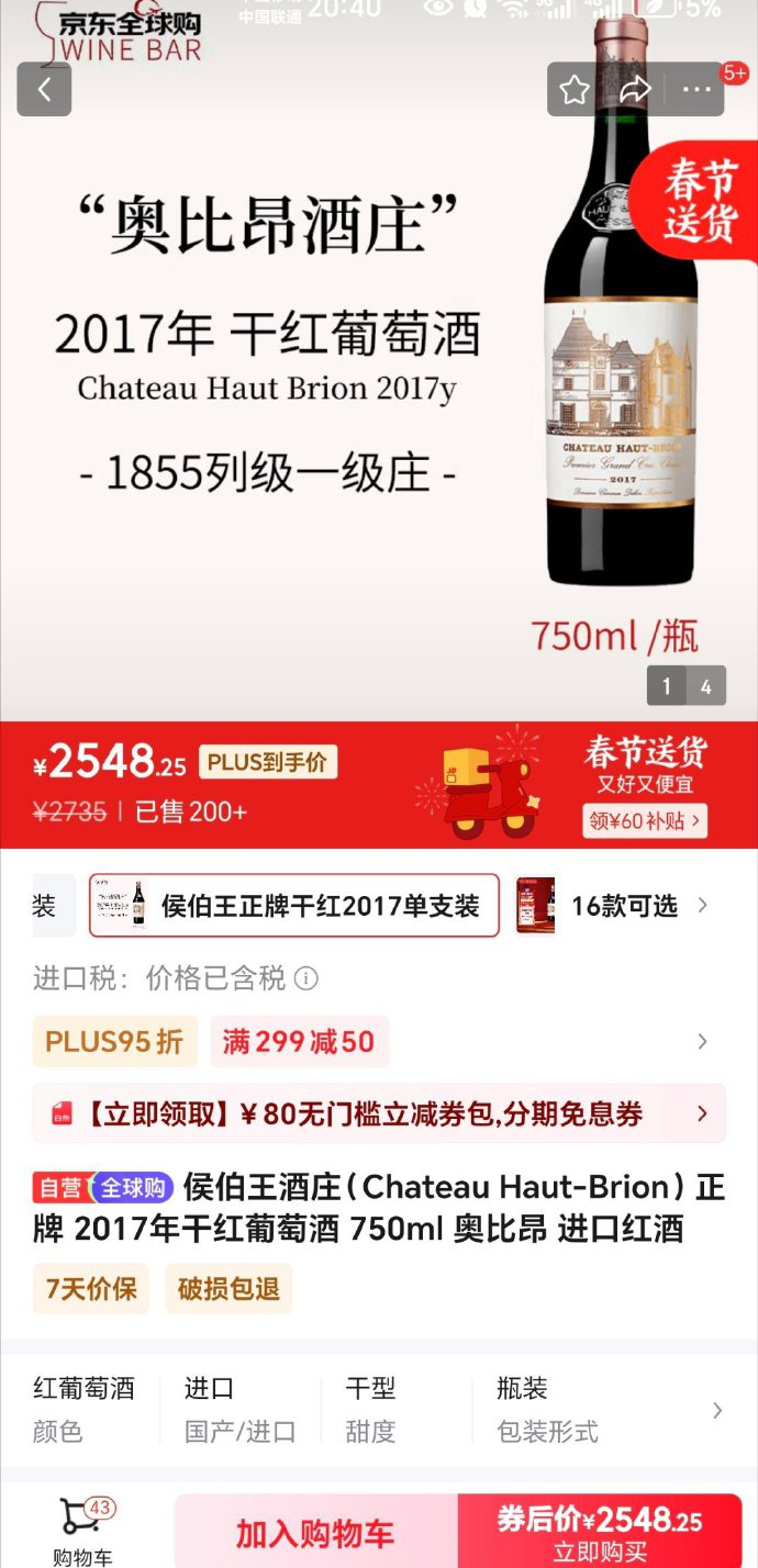 波尔多五大之一侯伯王(红颜容)2017,RMB2548.25一瓶。基本比英国和香港市场都要便宜了。